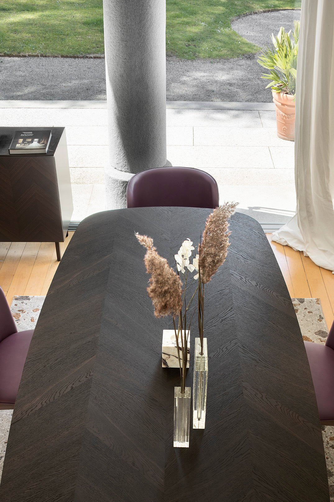 ABREY er et elegant og solid spisebord satt på en sokkel i massiv ask. Elegansen til dette bordet ligger i en ren enkel design, som fremhever den flotte bordplaten i herringbone.