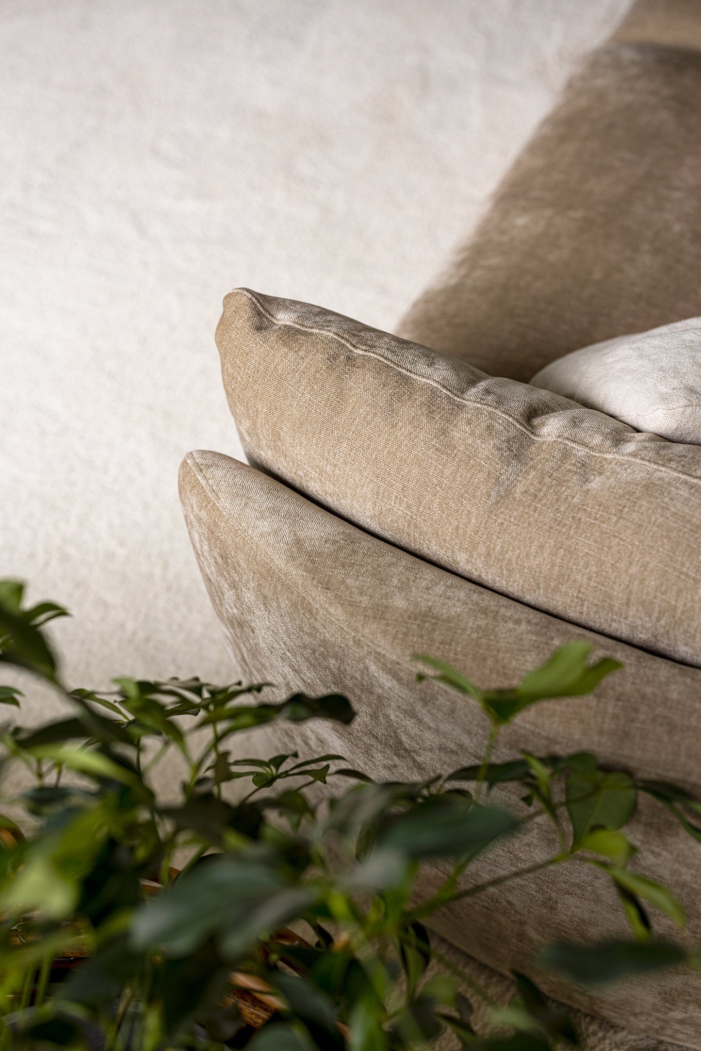 Sofaen er avbildet i chenille tekstilet: Wildflower i fargen 2 cold beige. Denne tekstilen er en blanding av polyester og lin, kan vaskes i maskin på 30gr. Wildflower produseres i 12 farger.