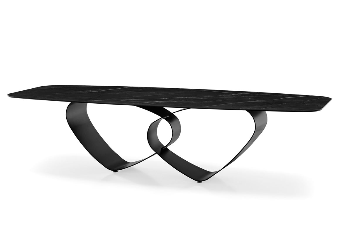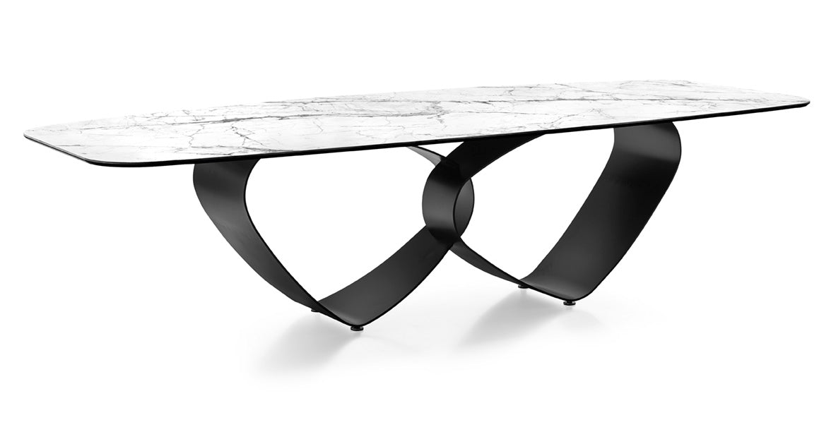 Breeze spisebord 250 er et elegant bord uten i fast størrelse, med bordplate i keramsik sten plassert på en formet base i metall. Et skulpturelt og vakkert spisebord