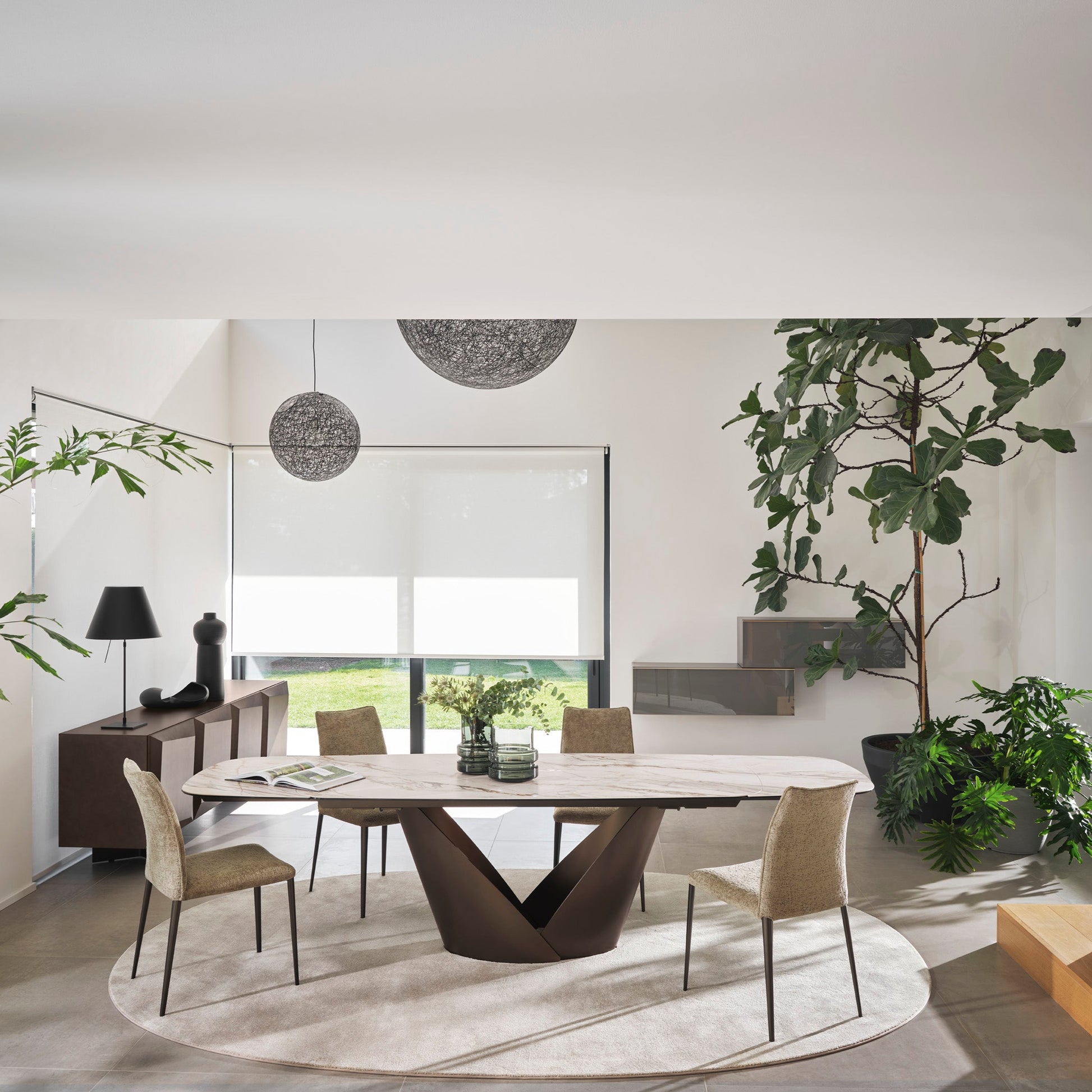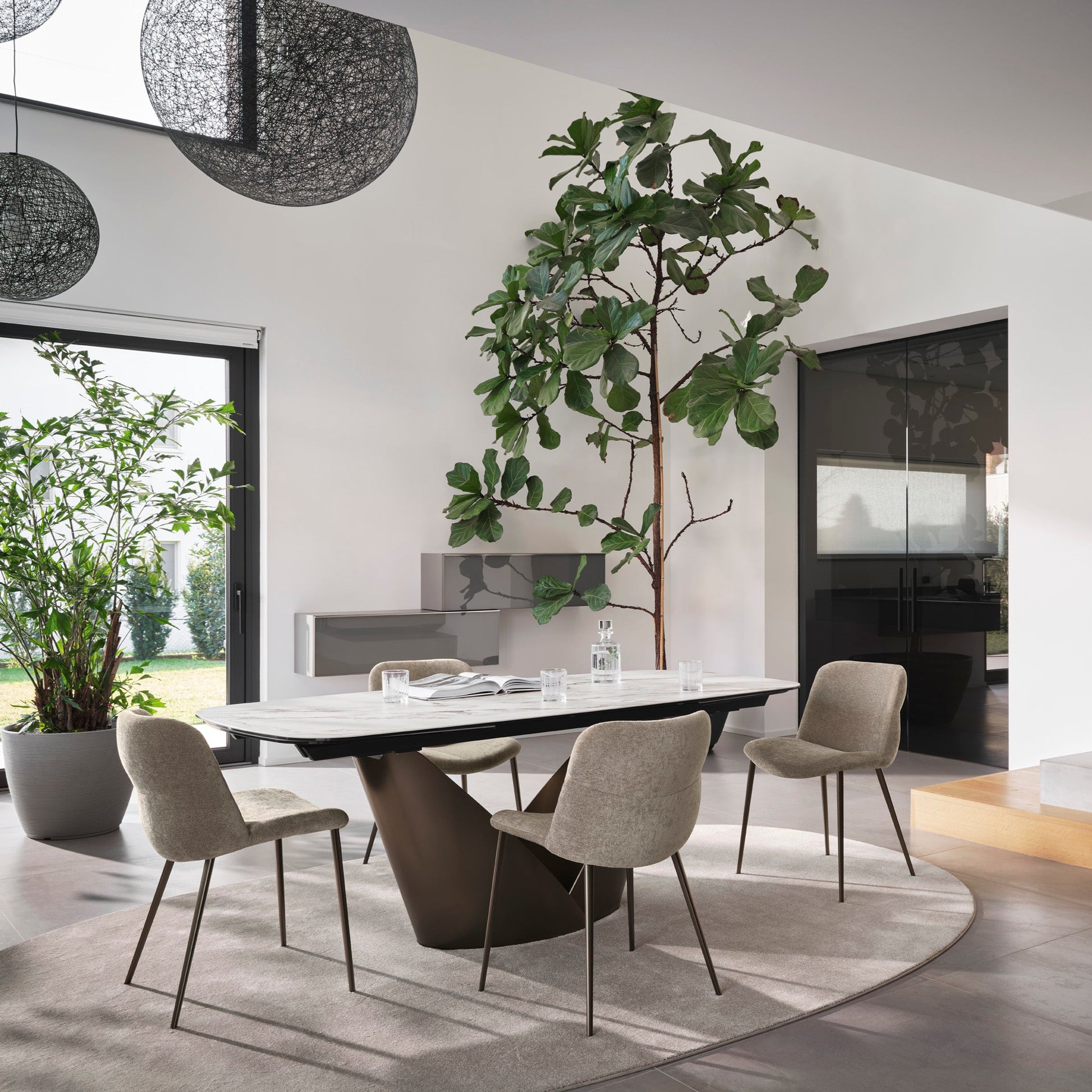 Calla ble lansert under Salone del Mobile i Milano i 2025, og kombinerer italiensk formspråk med høy funksjonalitet. Serien leveres i to uttrekkbare størrelser og to faste varianter, slik at du kan finne bordet som passer perfekt til ditt behov. Velg mellom tre ulike lakkeringer på basen, og bordplater i eksklusiv keramisk stein – ideelt for et slitesterkt og raffineret uttrykk. For de faste modellene kan du også velge dekorative bordplater i finért herringbone-mønster, som tilfører varme og karakter.