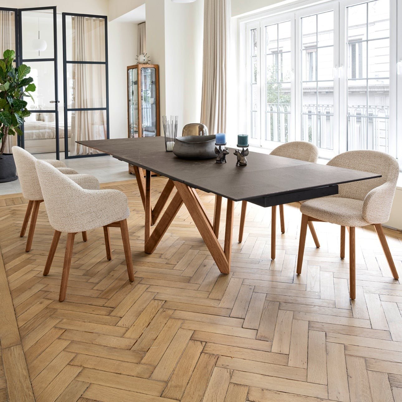 CARTESIO-"200 bordet utstråler behersket eleganse. Denne utgaven har en kvadratisk keramisk topp satt på en dekorativ heltre ramme sammensatt av 4 rektangulære "V"-elementer. Cartesio har to sideutrekk som kan åpnes individuelt, og utvider bordet deretter.