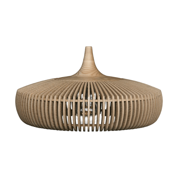 Clava Dine Wood lampeskjermen er designet ut fra en håndverksteknikk som krever en unik presisjon og nøyaktighet på grunn av den lille avstanden mellom hver lamell. Trelamellene er laget av laserskåret ask og eikefiner med massiv eiketopp.