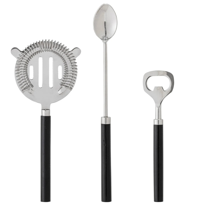 Løft hjemmebaren din med dette elegante barsettet fra Bloomingville. Settet er laget i solid rustfritt stål og inkluderer tre uunnværlige redskaper: en sil for å skille ut faste ingredienser, en rørepinne som gjør det enkelt å blande drinkene, og en praktisk flaskeåpner.