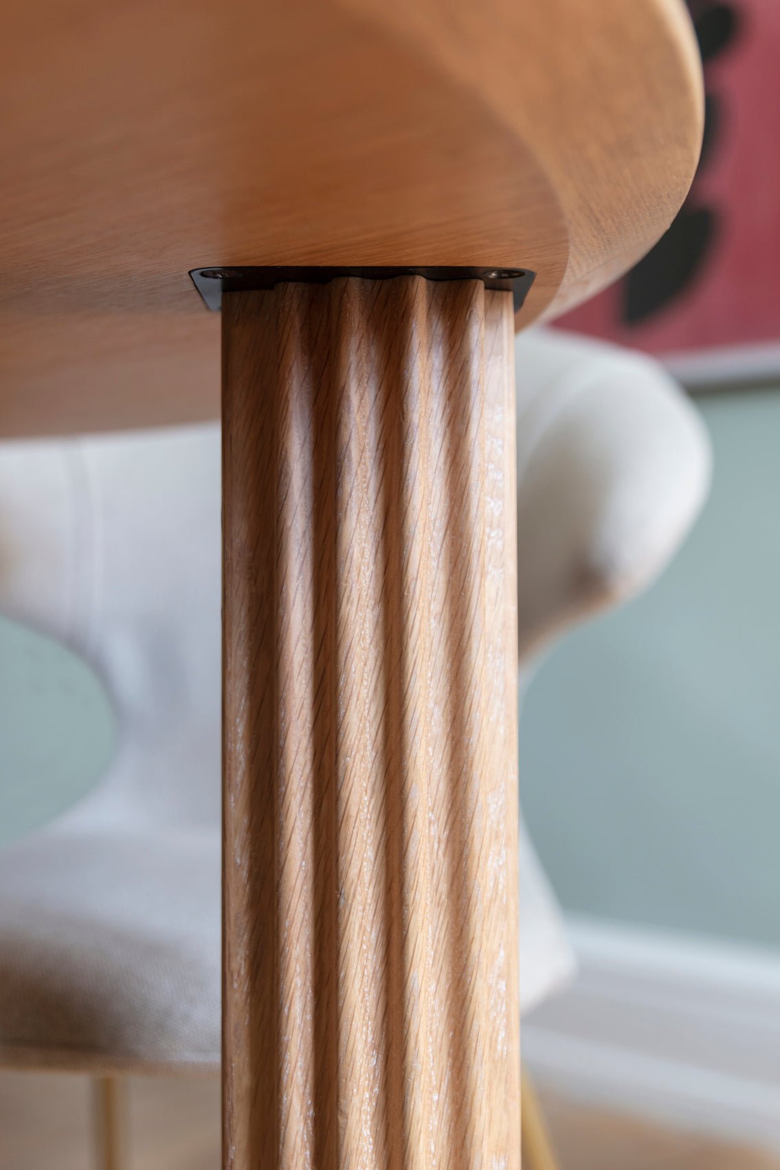 Dette runde spisebordet har ben i massiv eik og bordplate i eikefiner. Den subtile lettheten gir rommet en luftig følelse, noe som gjør den perfekt for mindre rom. Bordets utforming oppmuntrer til nære samtaler, med alle sentrert rundt midten.