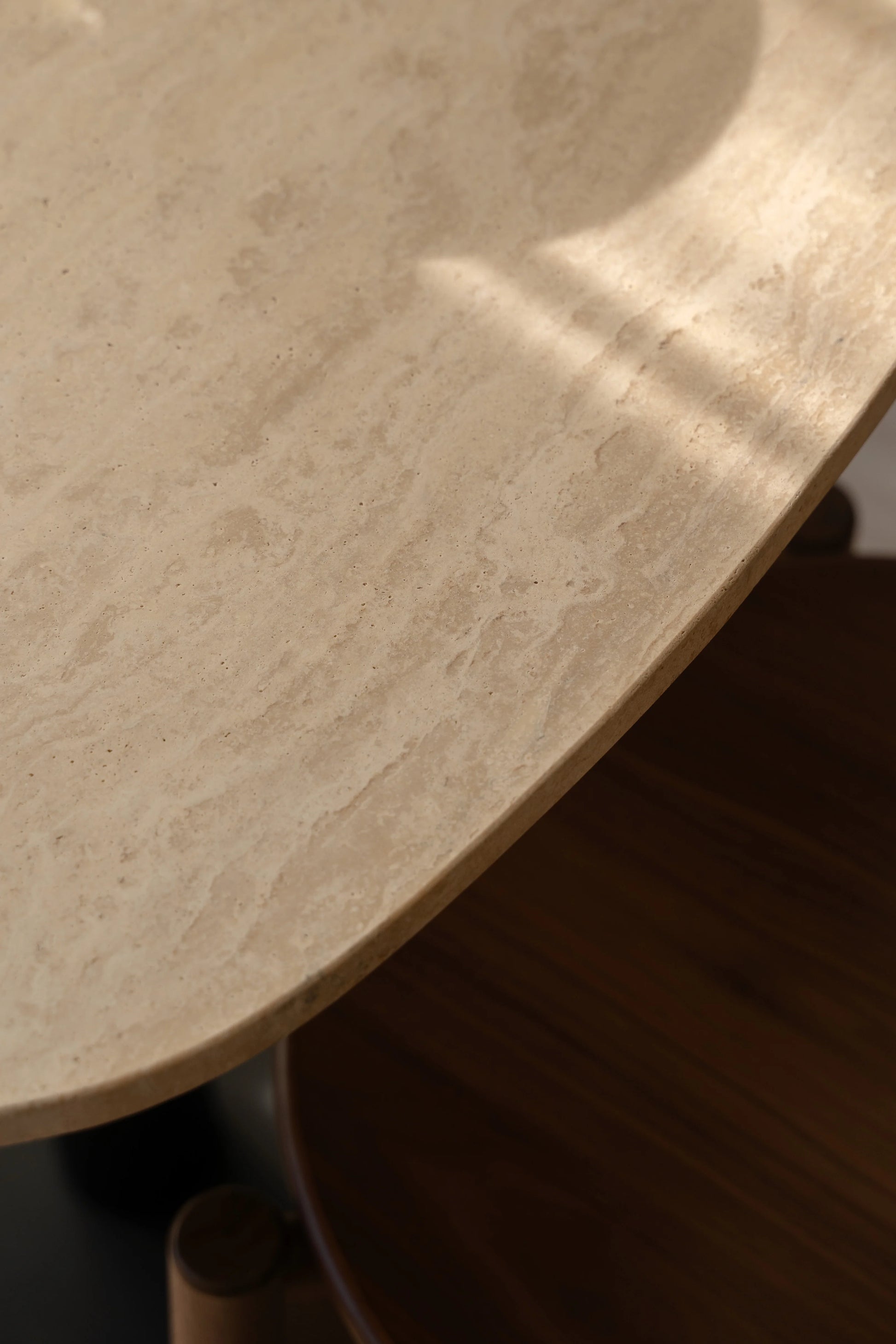 Materiale: Stål ben og base. Emerador marmor- eller travertine bordplate. Husk at naturlig sten får en patina etter bruk.