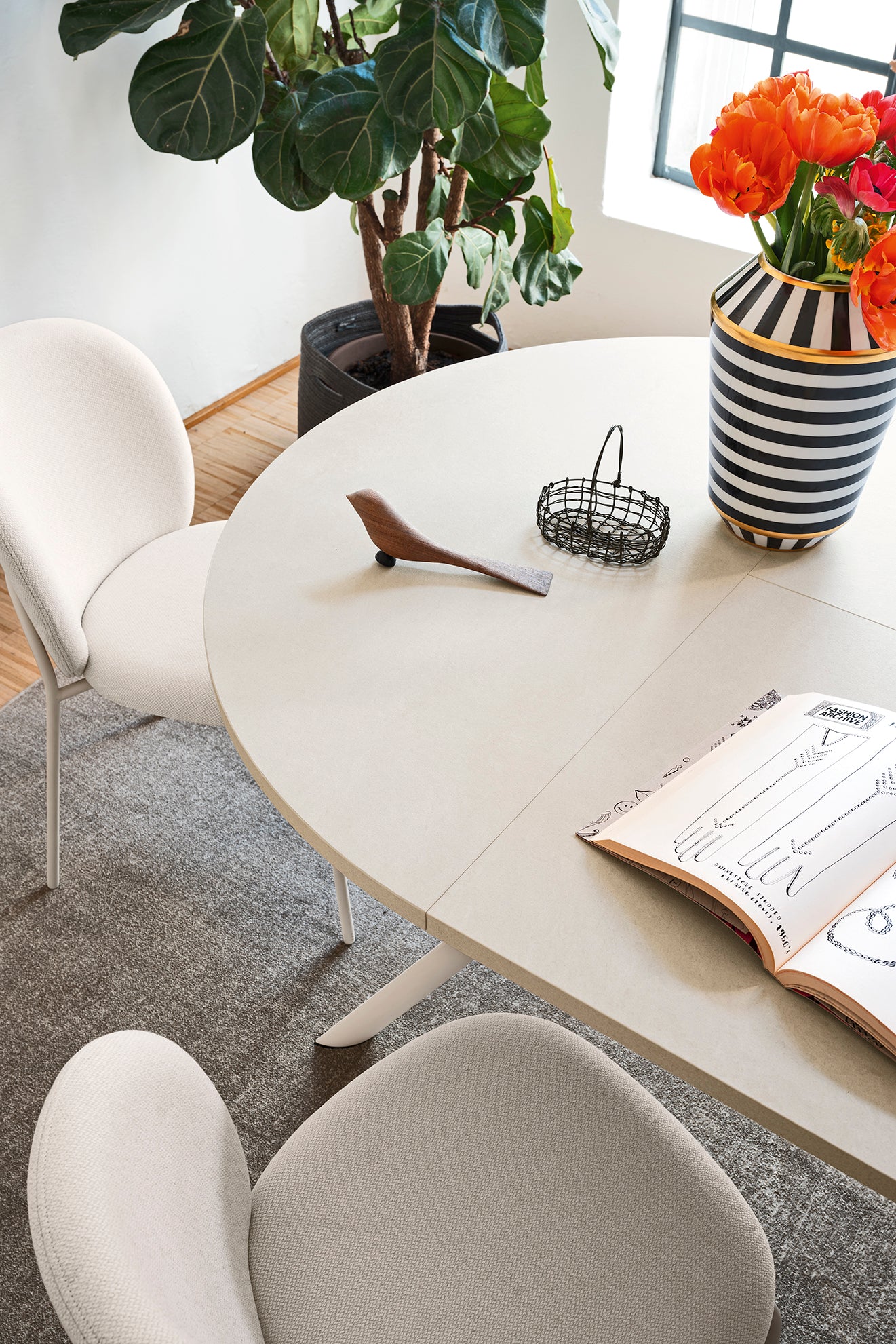 Giove er et flott designet rundt spisebord fra italienske Calligaris. Til tross for den pene basen, kan den lett utvides med det innebygde forlengelsebladet. Toppen er tilgjengelig i melamin, frostet glass eller keramikk. Toppen av keramikk og glass har ileggsplate i en matchende farge laget av høytrykks-laminat.