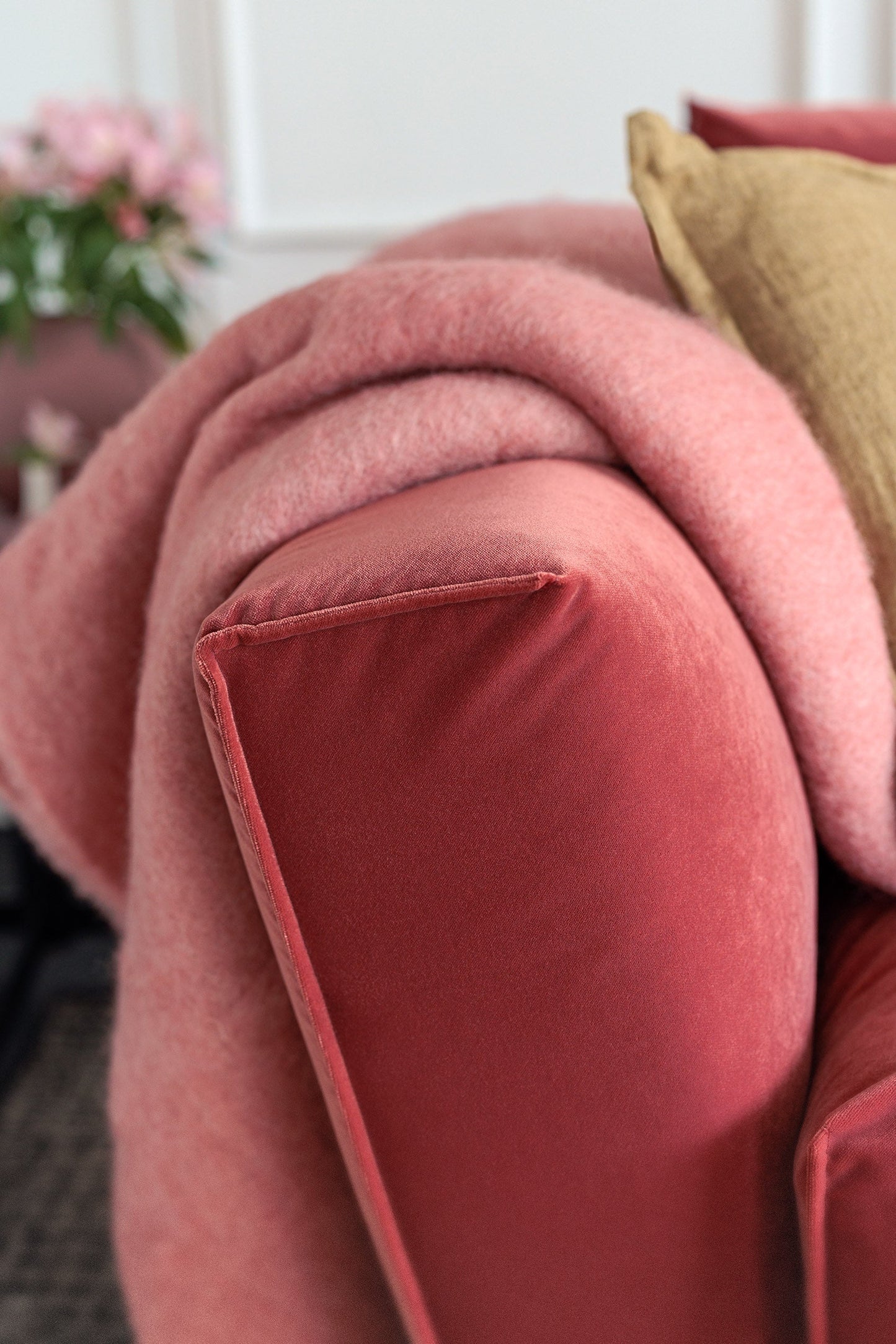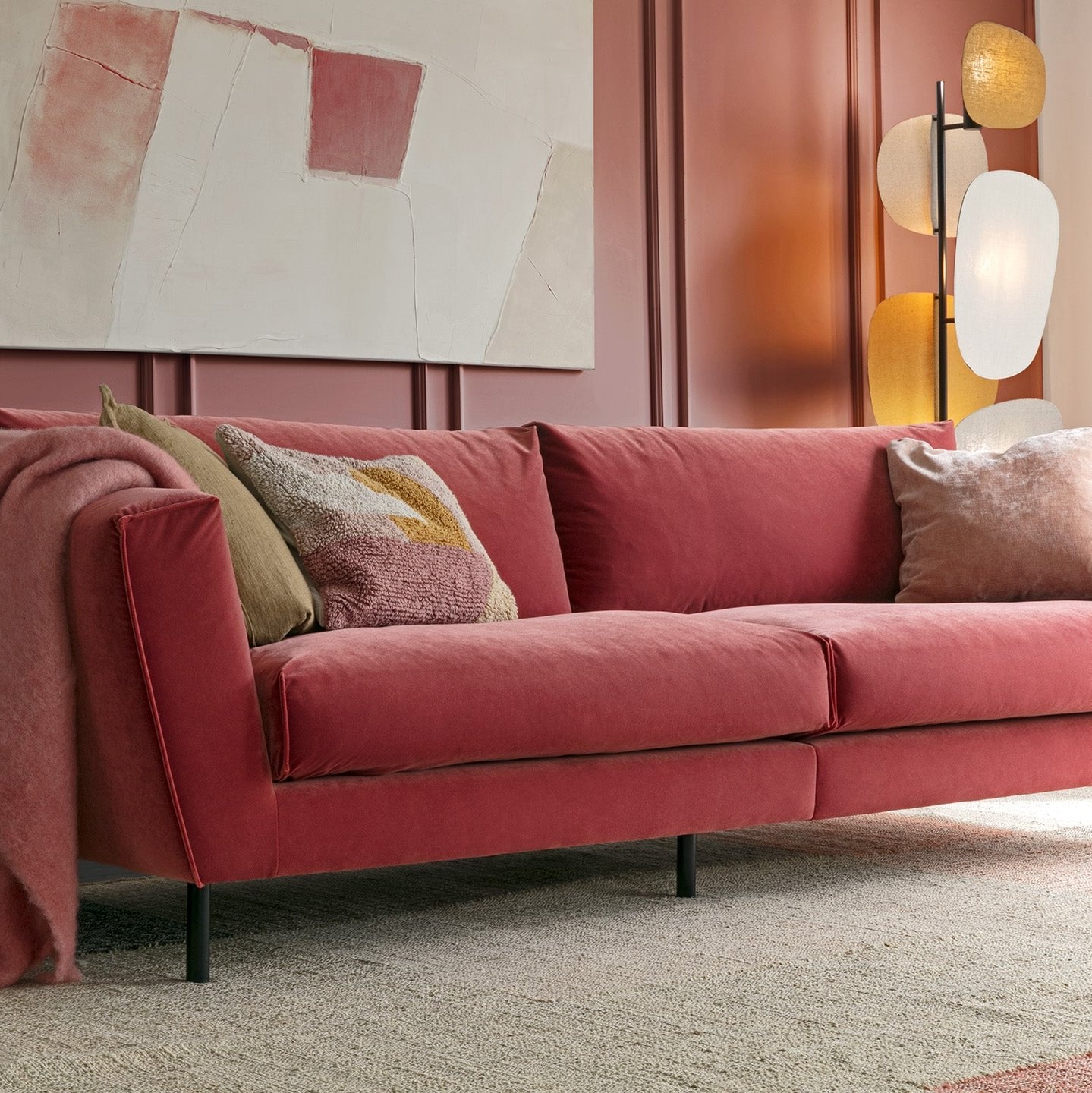 Avbildet sofaen er trukket i Classic Velvet Raspberry tekstil og har lux sittekomfort. Dette tekstilet er i prisgruppe 3.