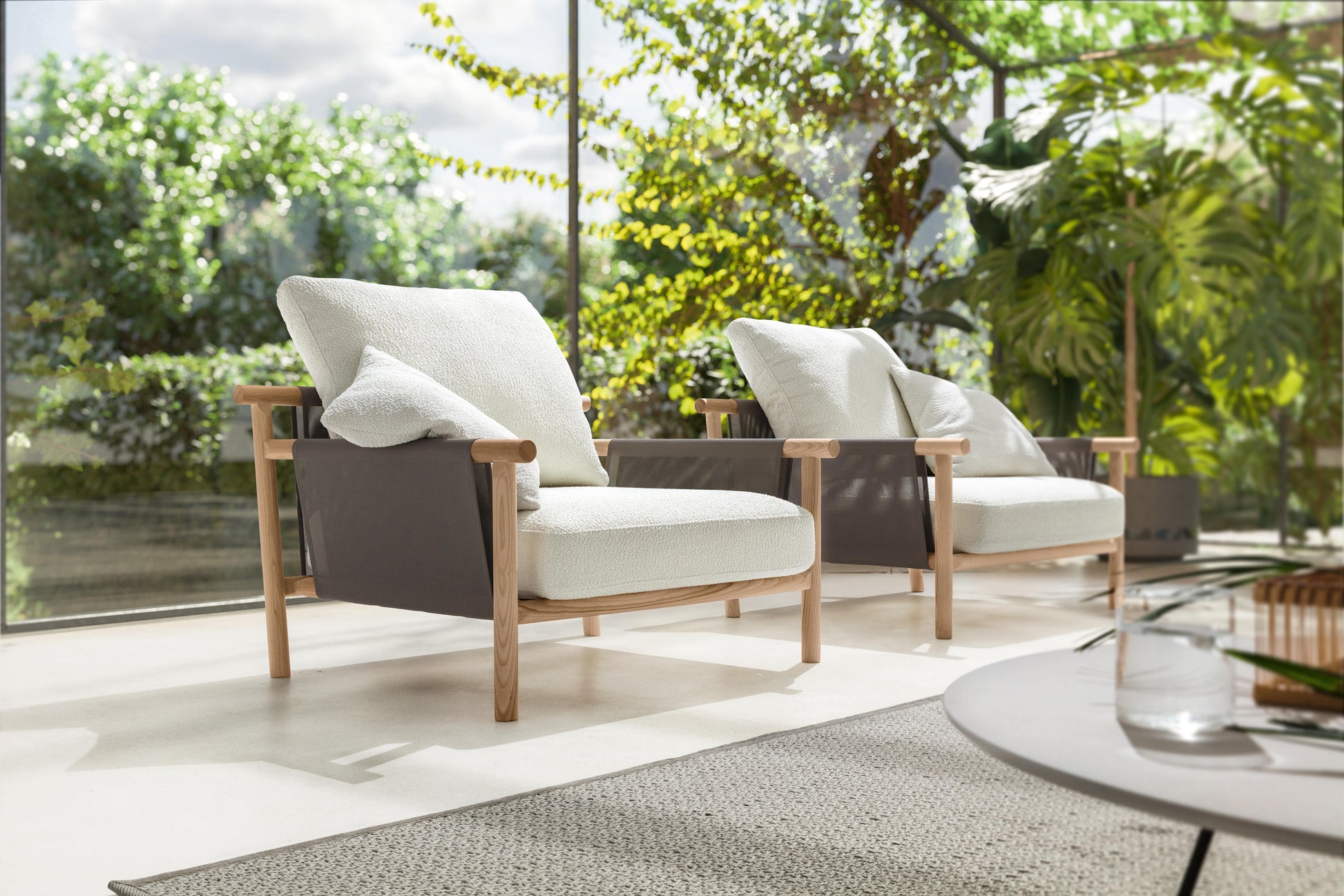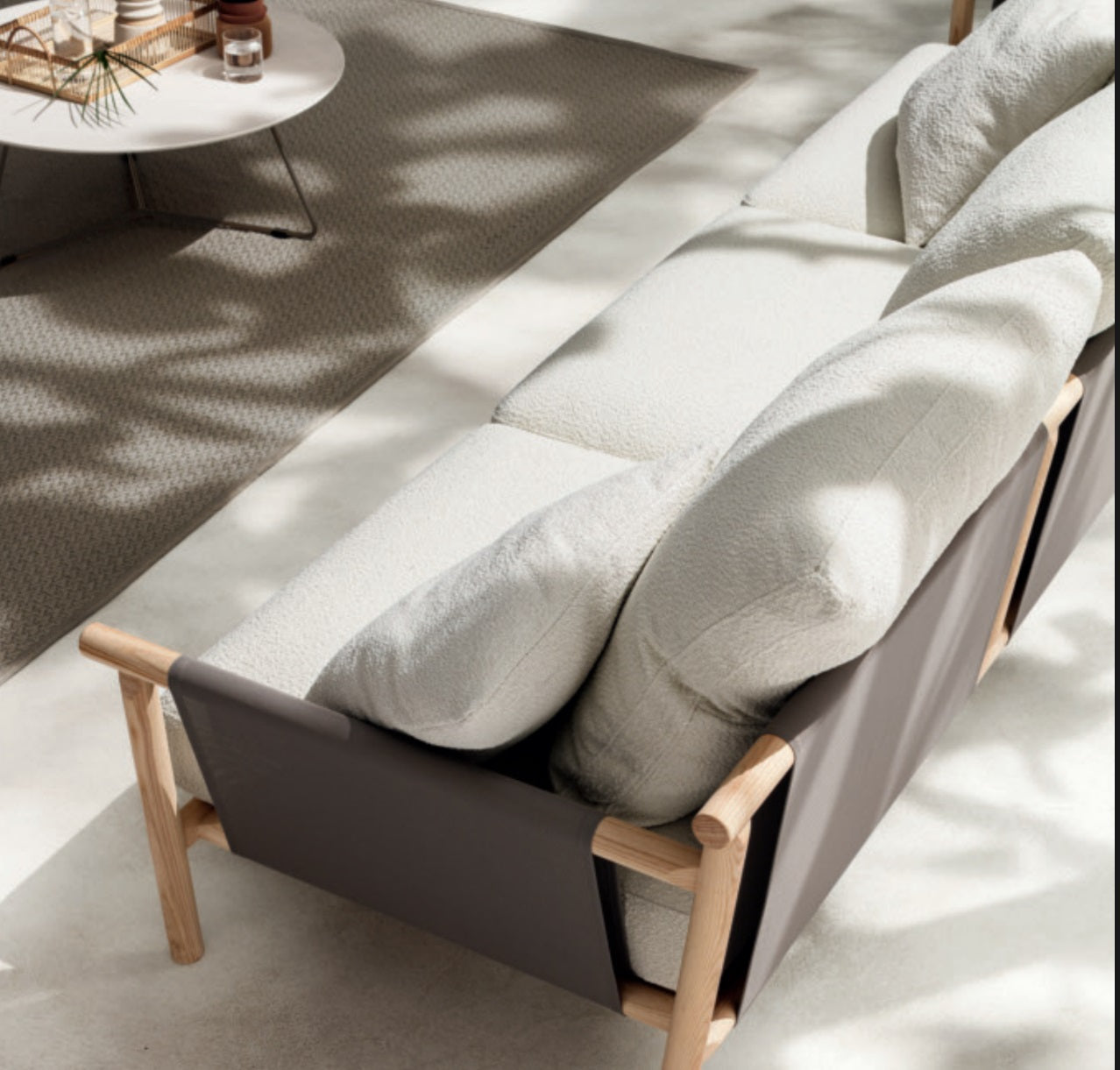 Flere av møblene er delvis trukket i utendørs mesh-stoff, som gir en spennende kombinasjon av materialer, delikate farger og gjennomførte detaljer. Dette er modulære hagemøbler som lar deg sette sammen soner og uttrykk etter behov – med både funksjon og estetikk i fokus. Velg mellom lys eller mørk trekk på armer og flere tekstil på puter. I nettbutikken er det mindre valg en i virkeligheten, så kontakt oss for mer informasjon.