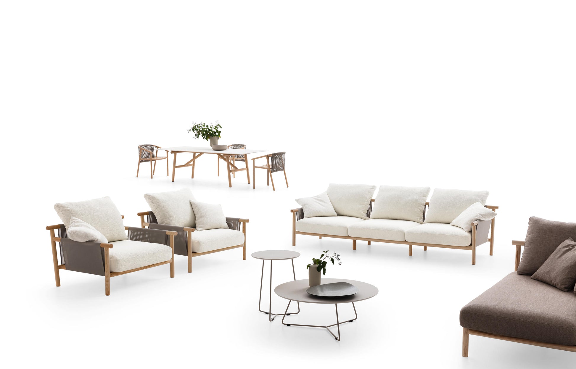 Denne elegante utekolleksjonen består av sofaer, lenestoler og chaiselonger i ulike størrelser til loungeområdet, samt bord og stoler til spiseplassen. Resultatet er en komplett serie med design utemøbler som passer til enhver type uterom – fra romslige terrasser til mindre balkonger.