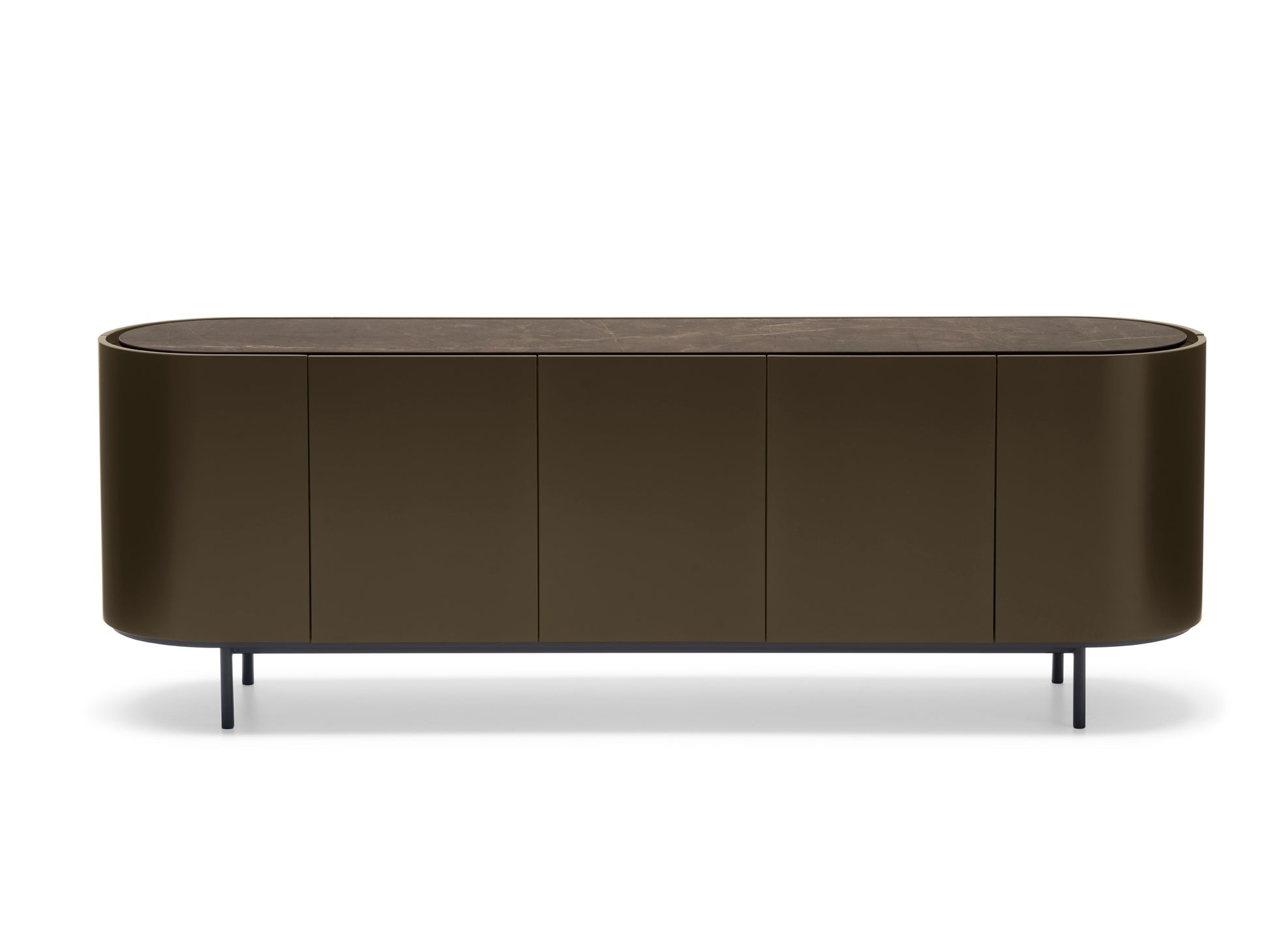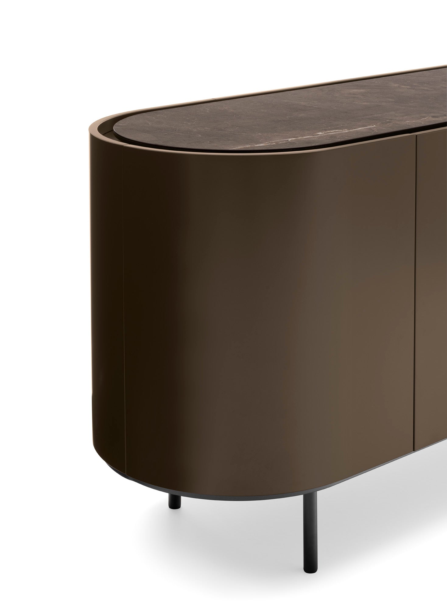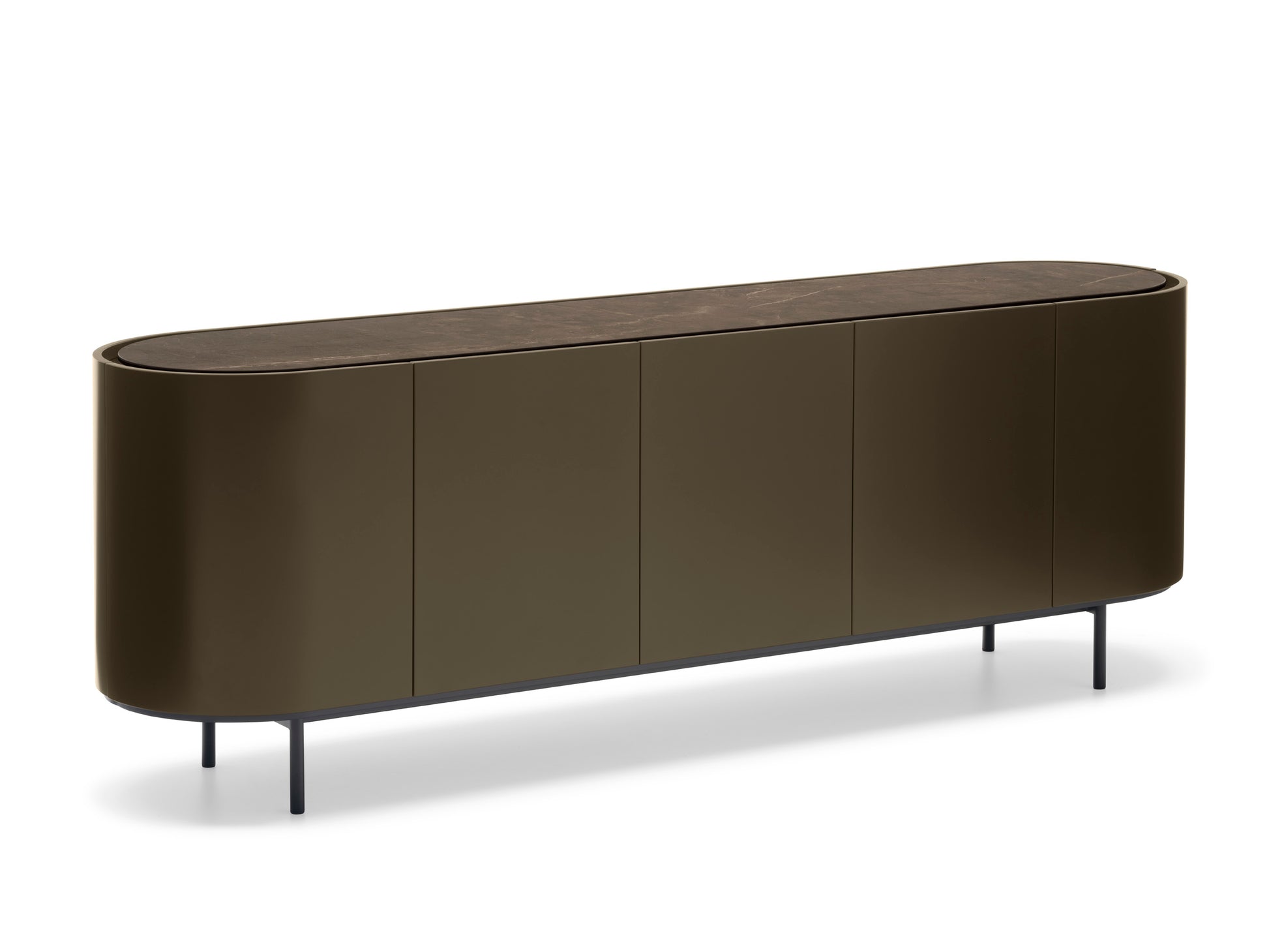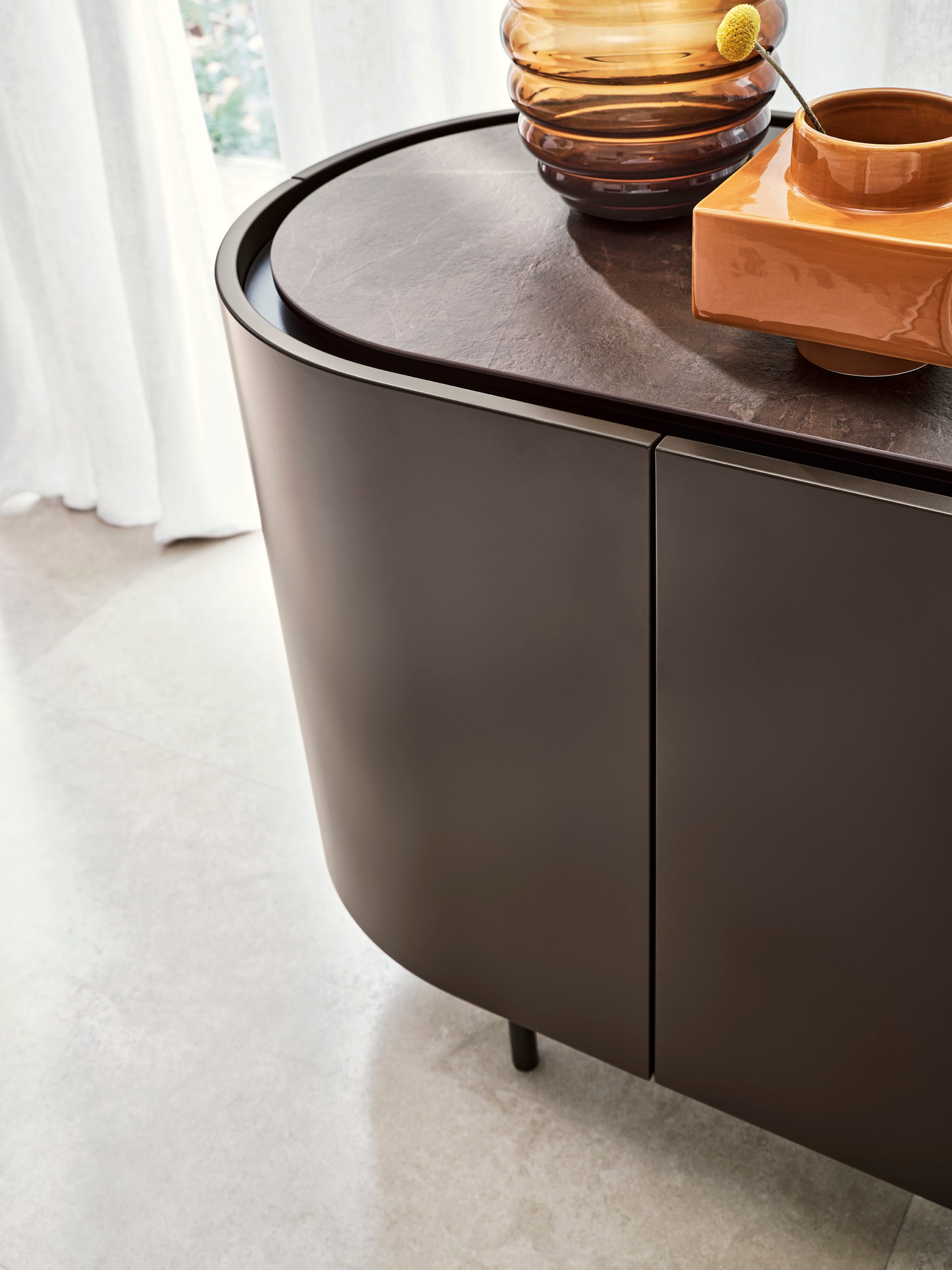 LAKE Bronze skjenk er et stuemøbel som skiller seg ut med sin slanke harmoniske design. På en forhøyet base har den en oval form, og skjønnheten forsterkes av den keramiske toppen som er litt tilbaketrukket fra kanten, og skaper et mellomrom mellom dør og topp som er nyttig for å åpne dørene og skuffene.