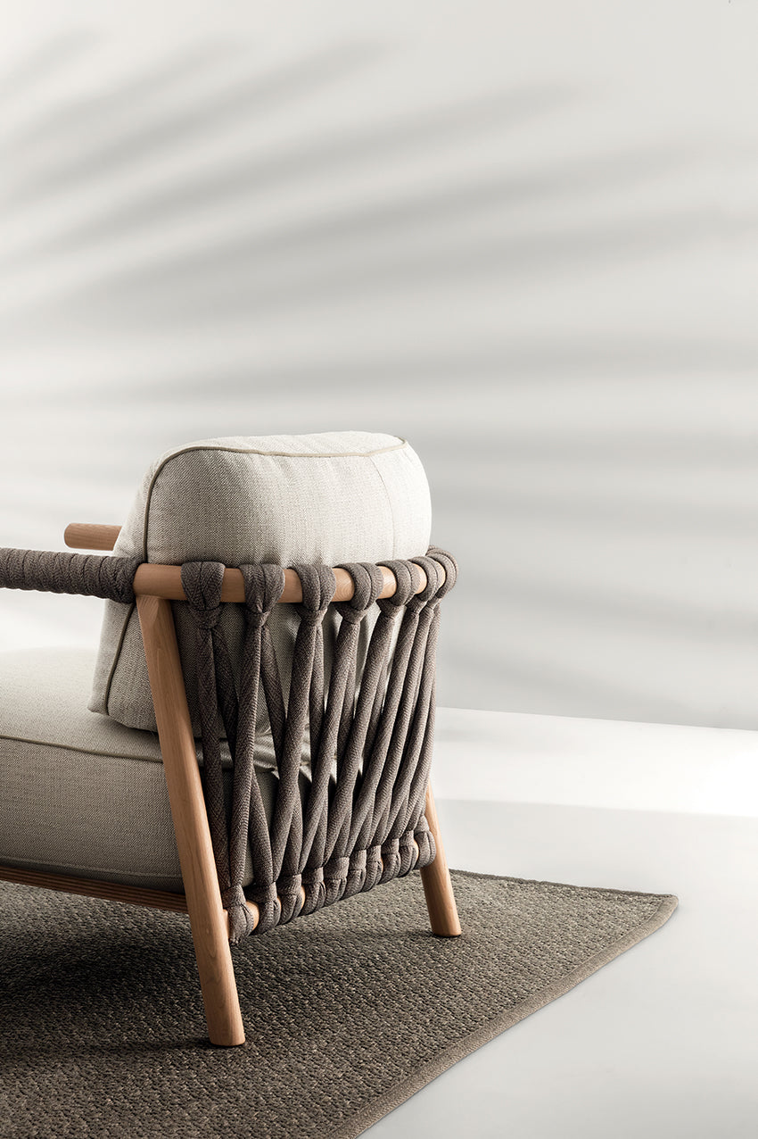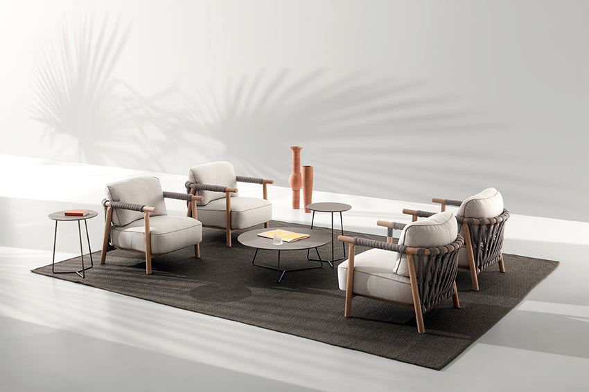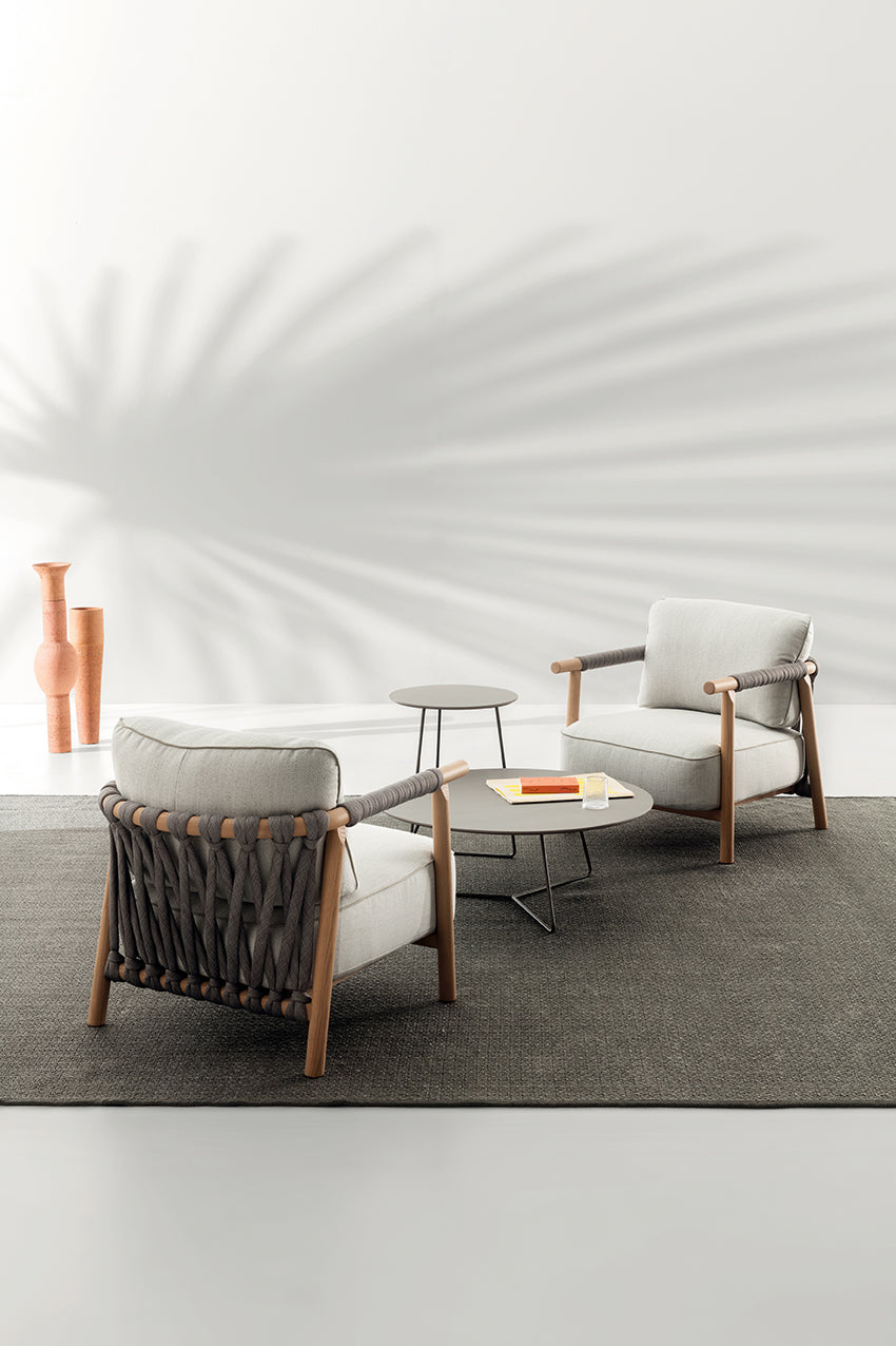 Denne ikoniske loungemodellen fra Ditre Italia, designet av Gabriele og Oscar Buratti, er nå lansert i en elegant utendørsversjon. Den runde rammen i tre kombineres med et håndflettet tauverk i diamantmønster – en perfekt balanse mellom design og slitestyrke.