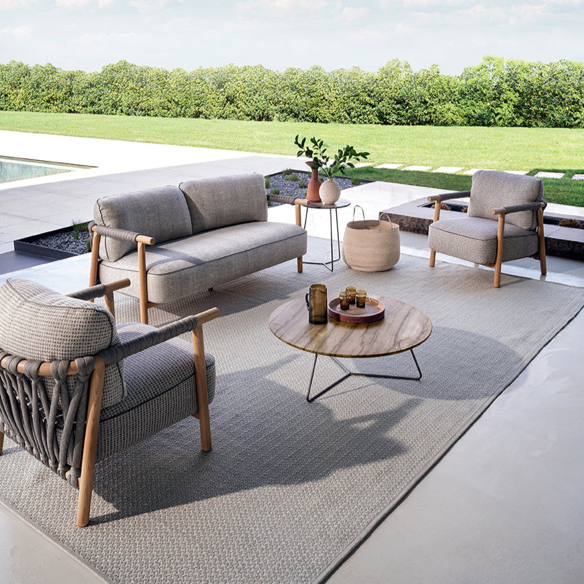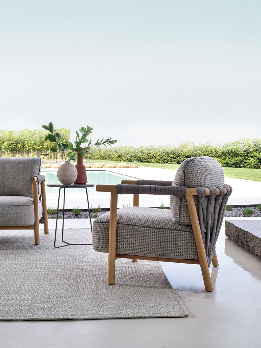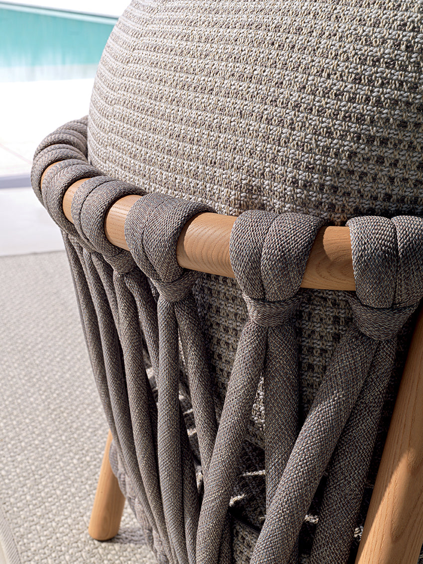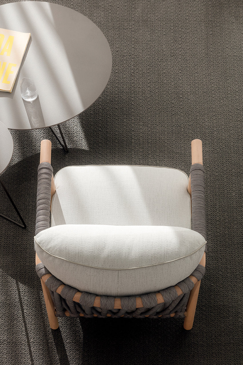 Denne ikoniske loungemodellen fra Ditre Italia, designet av Gabriele og Oscar Buratti, er nå lansert i en elegant utendørsversjon. Den runde rammen i tre kombineres med et håndflettet tauverk i diamantmønster – en perfekt balanse mellom design og slitestyrke.