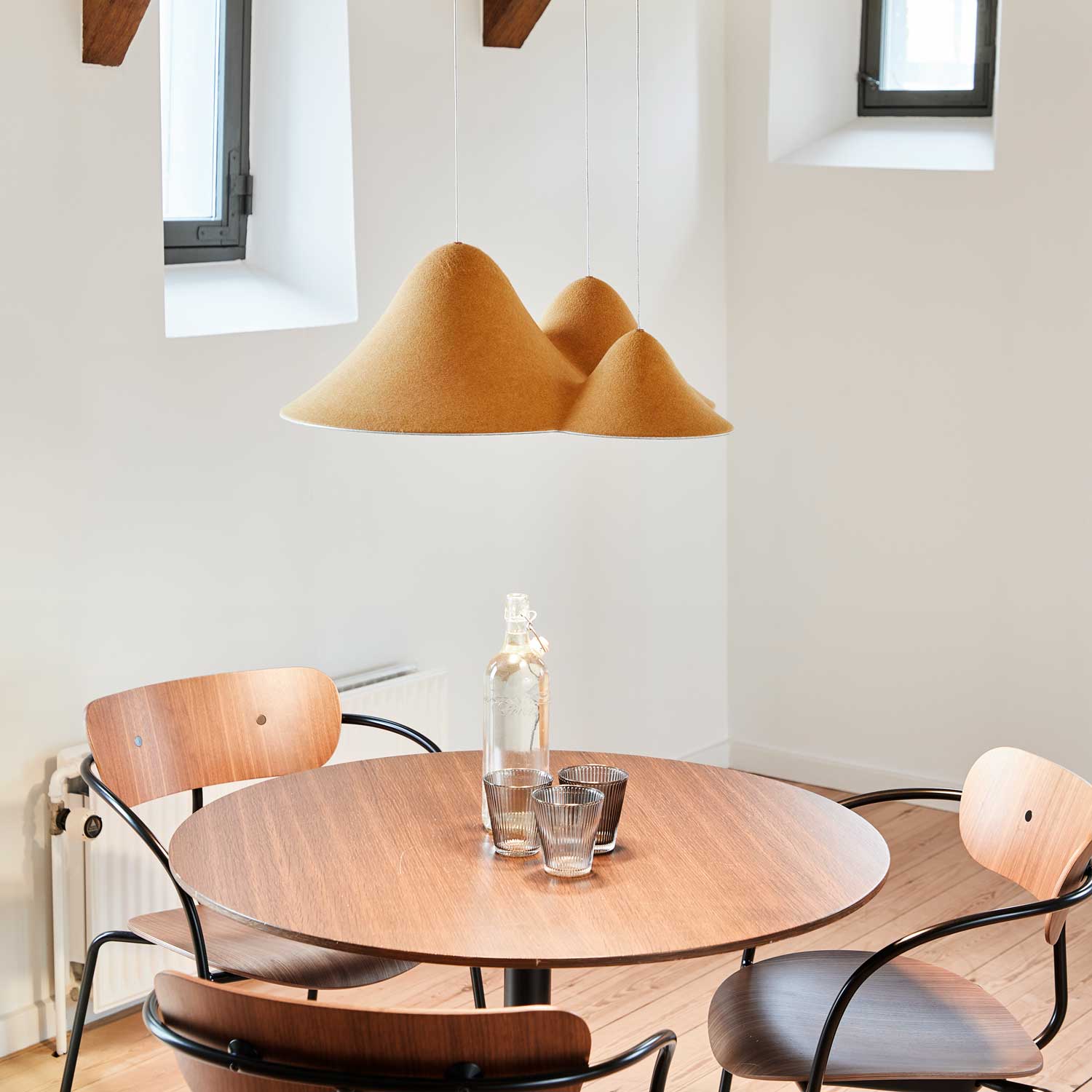 Panorama S pendellampen er inspirert av de myke formene og fargene fra naturens bakkelandskap. Dens jordgule eksteriør kombinert med den grå innvendige finishen minner om skumringens myke lys over bakker, som bringer en følelse av natur og harmoni inn i hjemmet ditt. Det unike designet, som elegant kombinerer tre buede former, skaper et visuelt uttrykk som er både beroligende og fengslende. Utstyrt med LED-teknologi og laget av aluminium, akryl og filt, står Panorama S som et symbol på kvalitet, lys og en varm atmosfære.