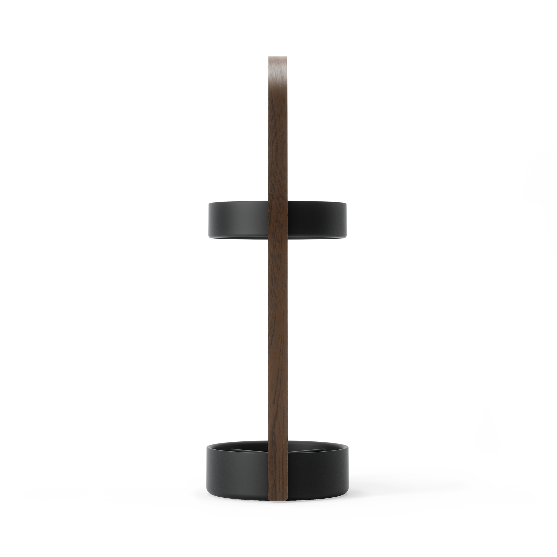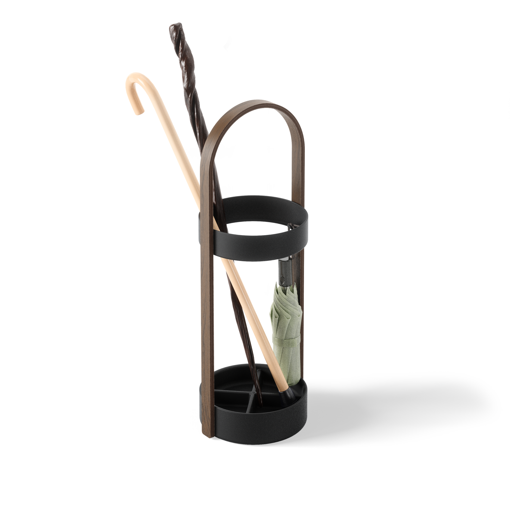 Stativet har en rund bunn og et buet håndtak i trefiner, toppet med en stålring. Smarte spor holder lange paraplyer på plass, mens små kroker øverst er perfekte for kompakte, korte paraplyer.