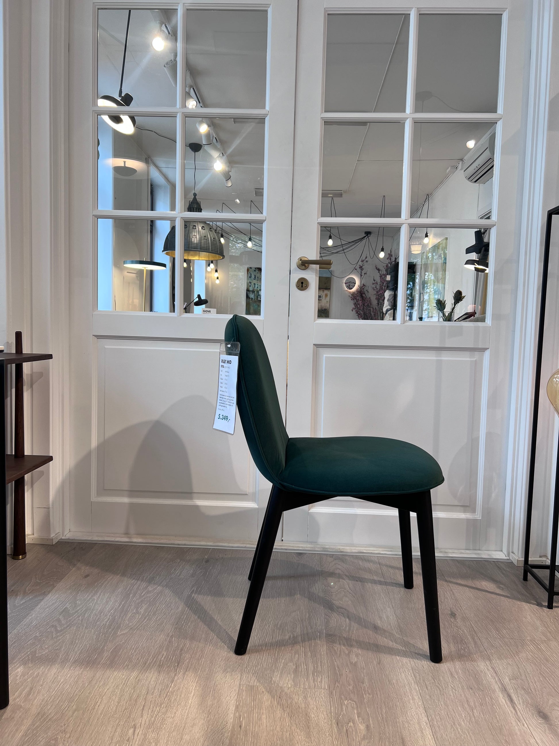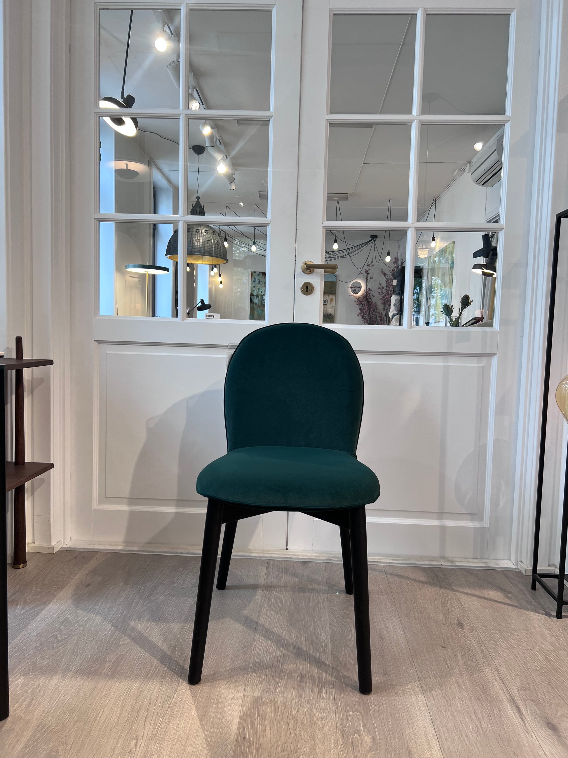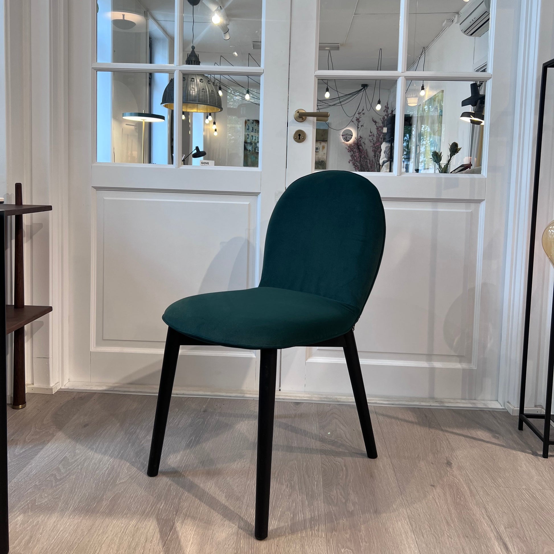 Vi har 1 stk Demomodell Riley spisestol som selges rett fra utstilling. Tekstilet er veluren Mat forrest green, ben i heltre farge sort.