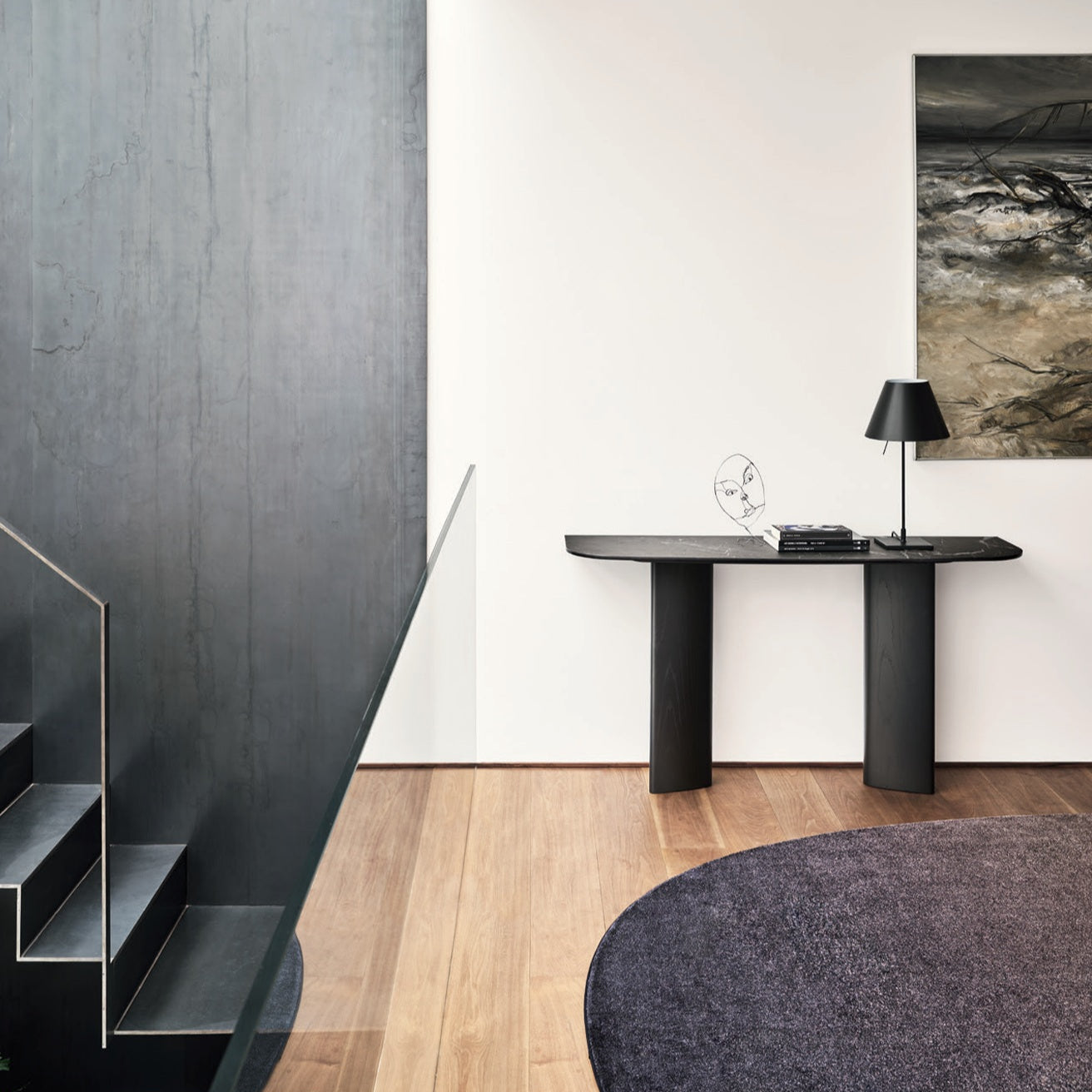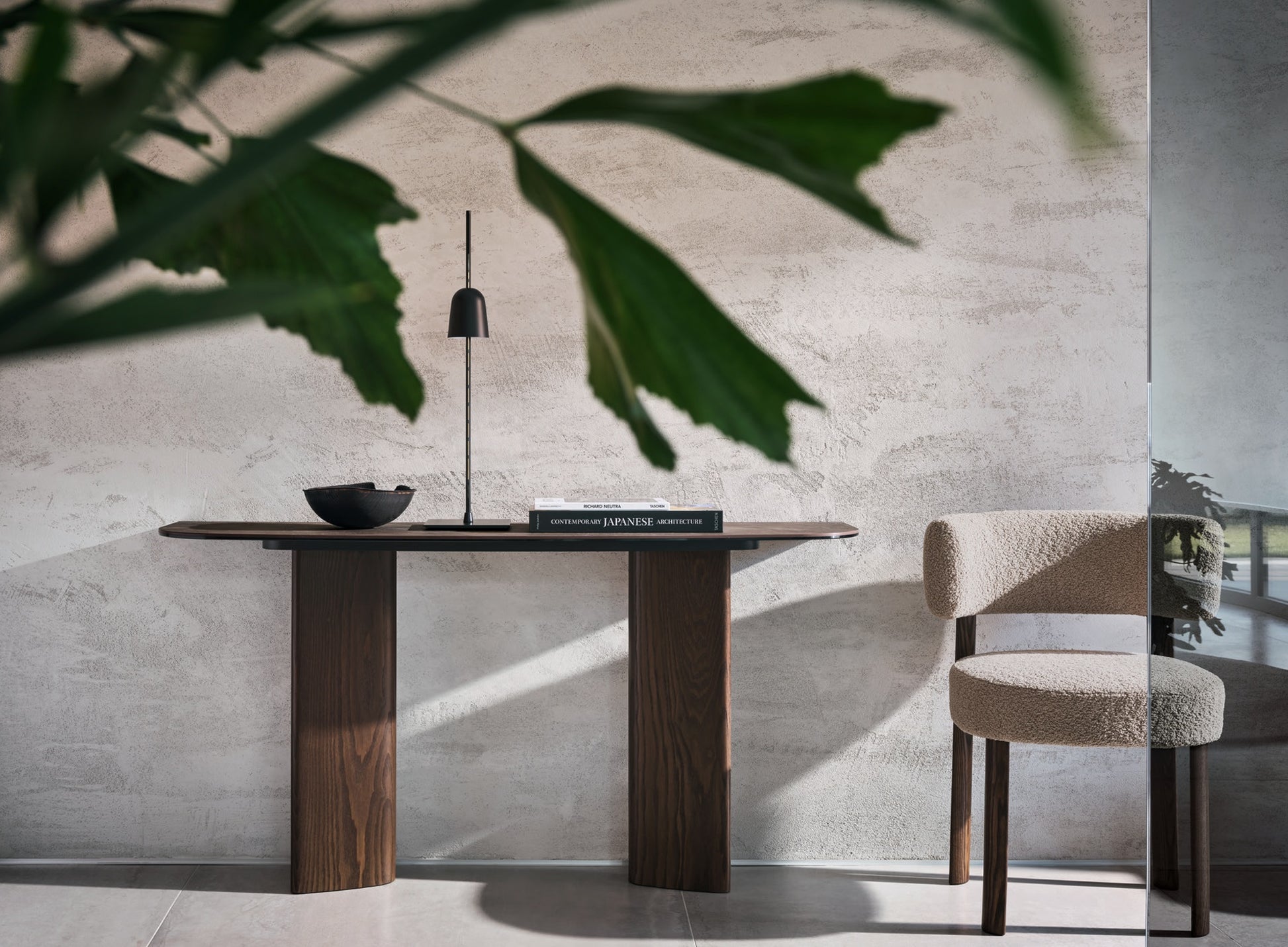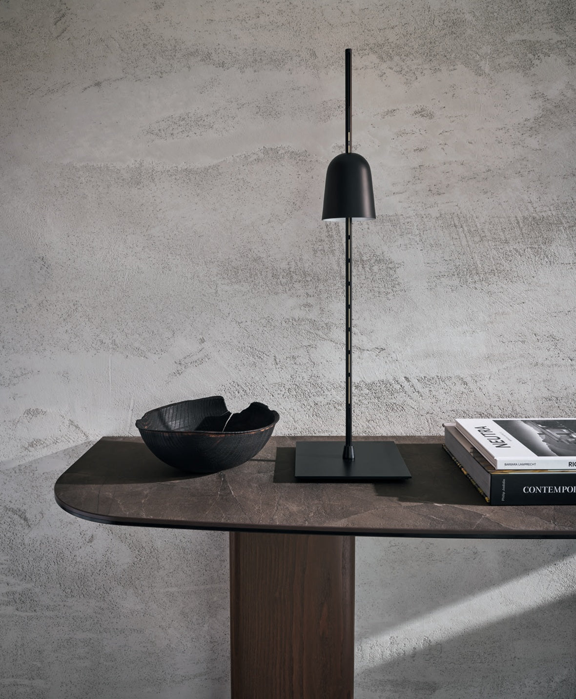 De flotte bena er i heltre ask med utførelsene matt svart, smoke eller valnøtt canaletto, og den keramiske toppen kommer Golden onyx, Salt white (matt), Black Onyx, i hvit marmor, svart calacatta marmor, Calacatta paonazzo , bronze, travertino og silk white marmor. Bordet fåes også i den flotte canaletto fineren med canaeletto ben og herringbone matt back med sorte ben.