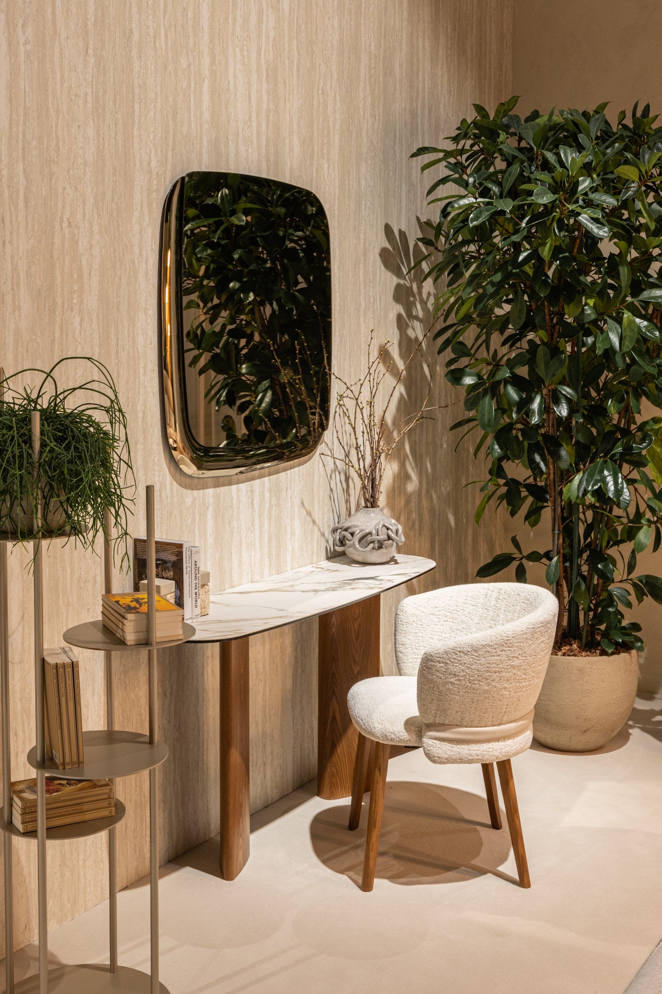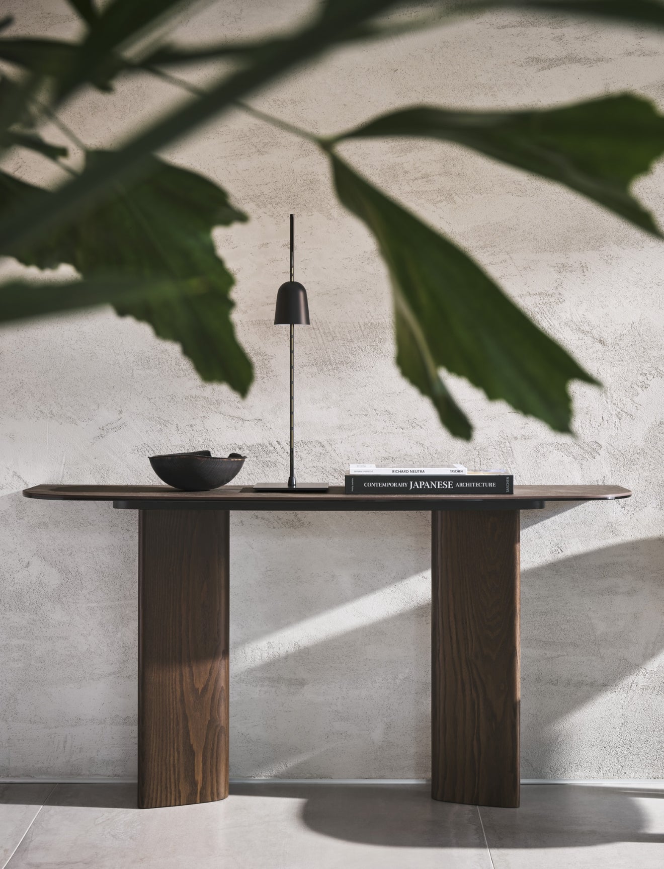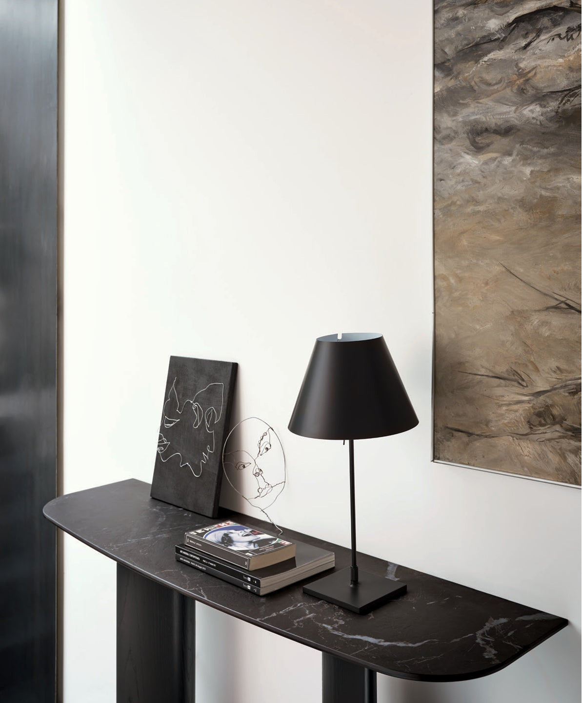 De flotte bena er i heltre ask med utførelsene matt svart, smoke eller valnøtt canaletto, og den keramiske toppen kommer Golden onyx, Salt white (matt), Black Onyx, i hvit marmor, svart calacatta marmor, Calacatta paonazzo , bronze, travertino og silk white marmor. Bordet fåes også i den flotte canaletto fineren med canaeletto ben og herringbone matt back med sorte ben.