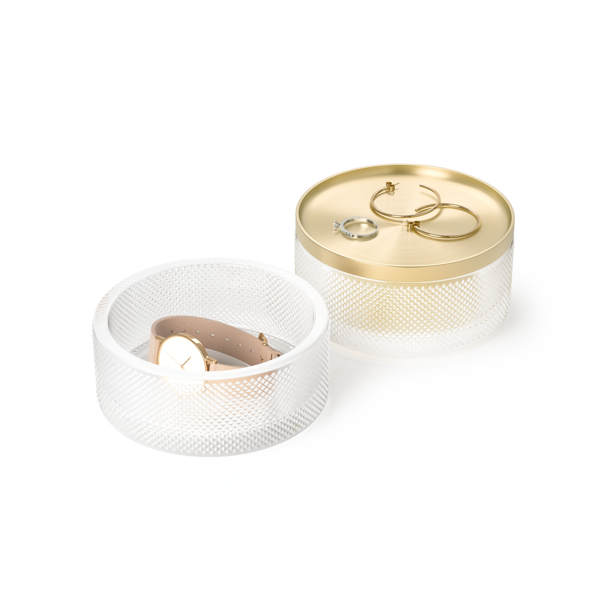 Låket i metall fungerer også som et lite brett for smykkene du bruker mest – slik at de alltid er lett tilgjengelige og samtidig ser vakre ut på utstilling. Med sitt kompakte design og tidløse uttrykk passer Tesora inn overalt, og holder ringene, øredobbene og armbåndene dine både organisert og beskyttet.