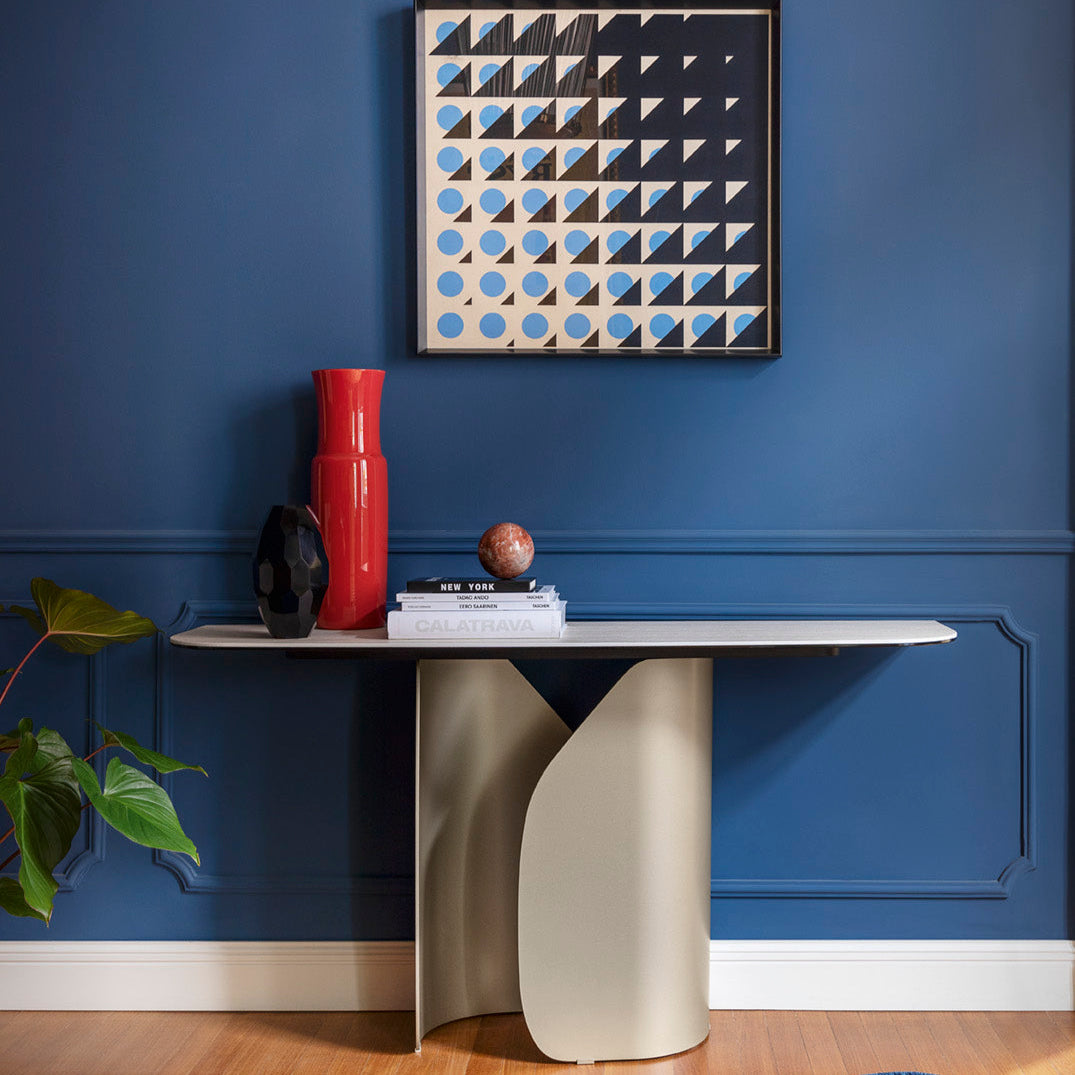 Twins konsollbordet henter sitt karakteristiske uttrykk fra det matchende spisebordet i samme serie. Den buede metallstrukturen gir et lett og moderne uttrykk, og løfter frem bordplaten med avrundede hjørner.