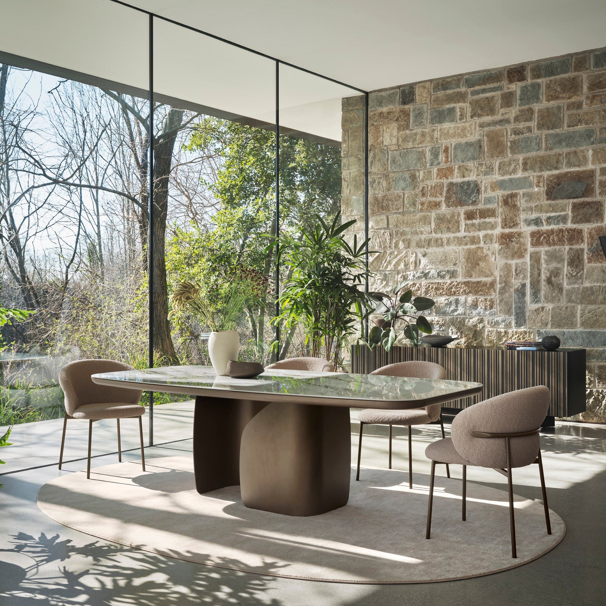 Den hviler på nylonglider, og toppene er tilgjengelige i flere utførelser av keramikk, trefiner eller Nilo bronseglass, og tilbyr et bredt spekter av tilpasning. Dette bordet gir et eksepsjonelt utvalg av alternativer, som spenner over faste og uttrekkbare varianter, i flere former.