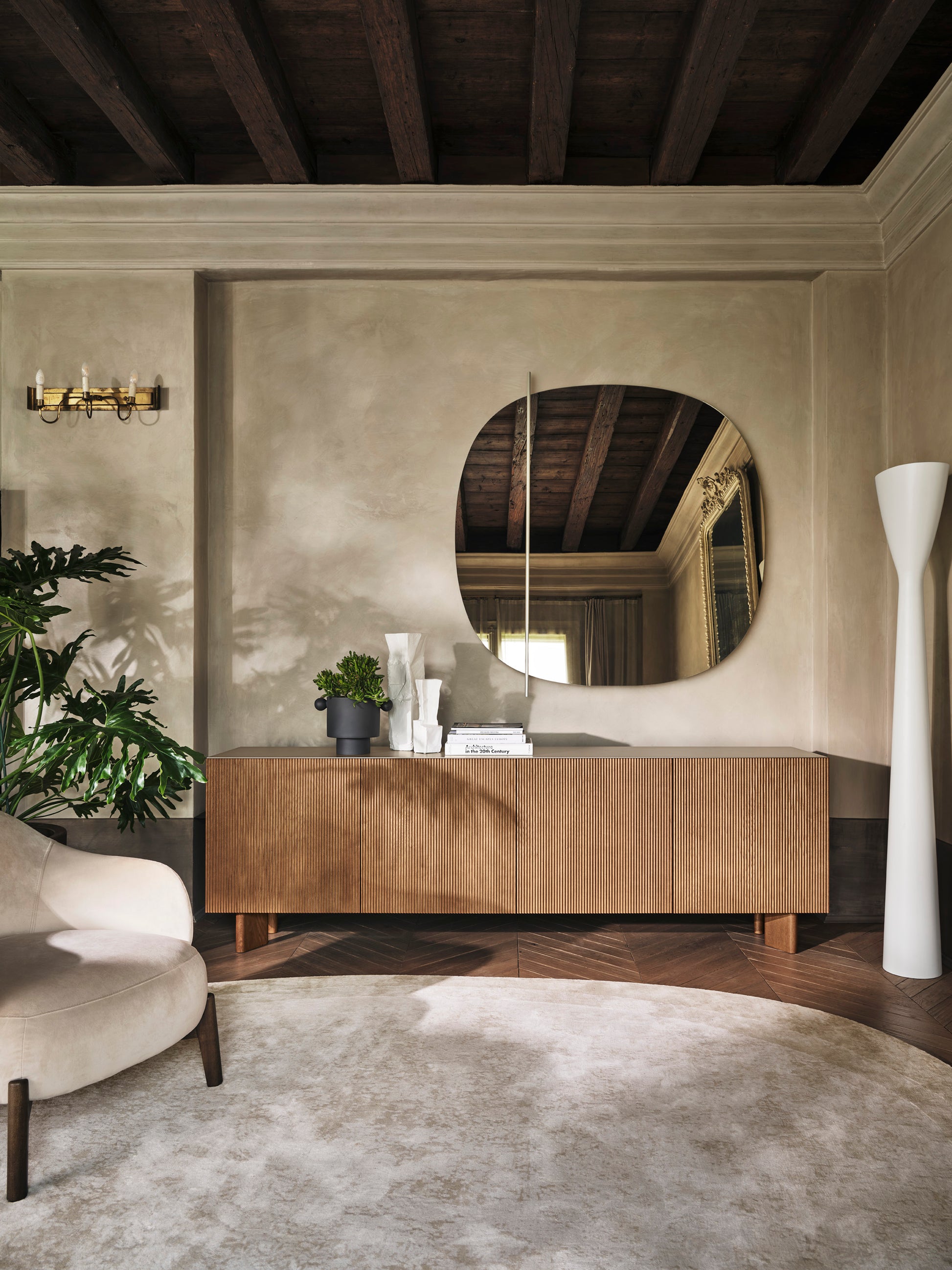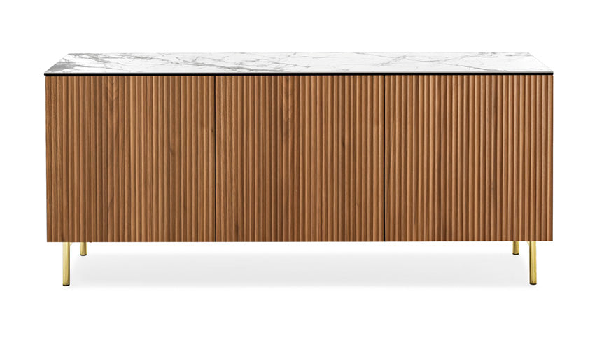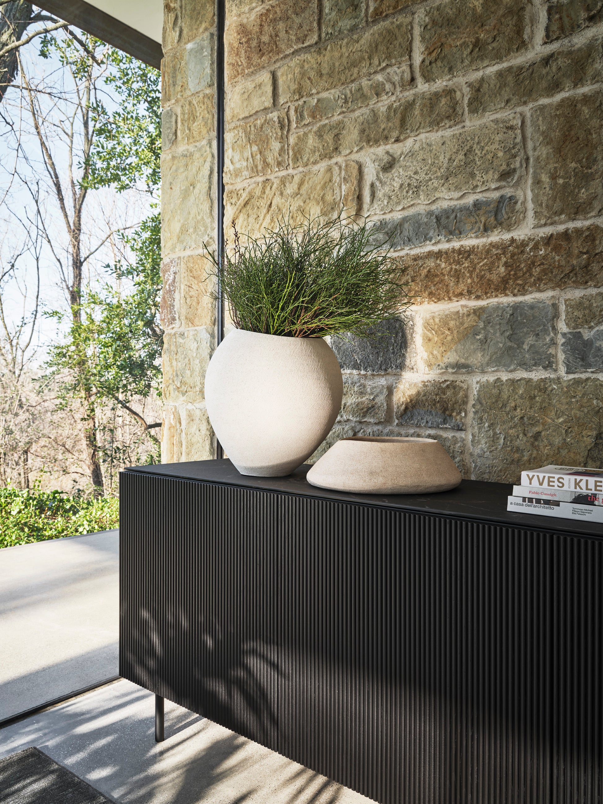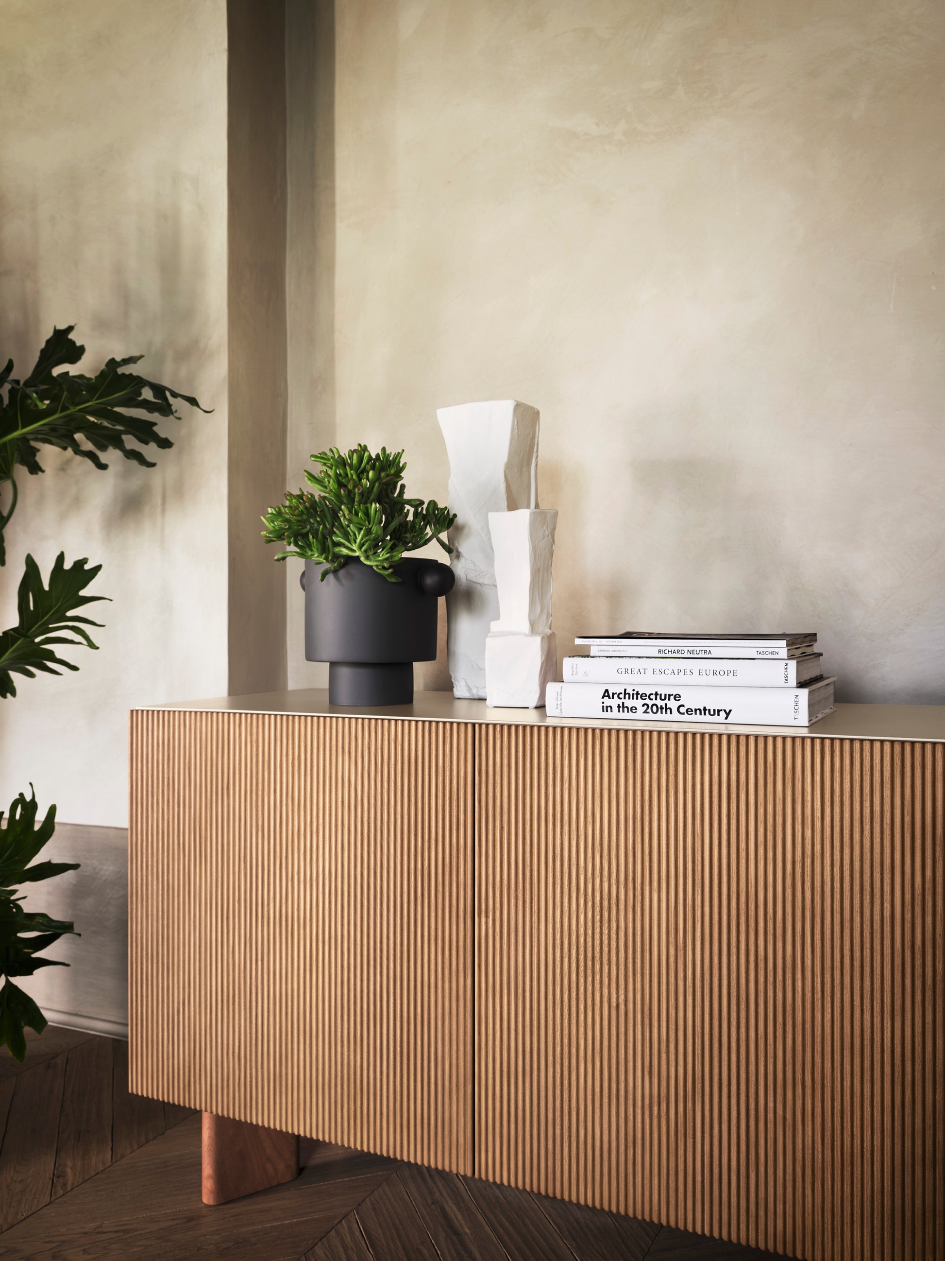 Vertical er en serie oppbevaringsmøbler og i klassisk sjenk utgave kommer den i 2 størrelser. 181 cm med 3 dører eller 240 cm med 4 dører. Dette er versjonen med de særegne spile dører i tre canaletto valnøtt eller mattsort lakkert,.